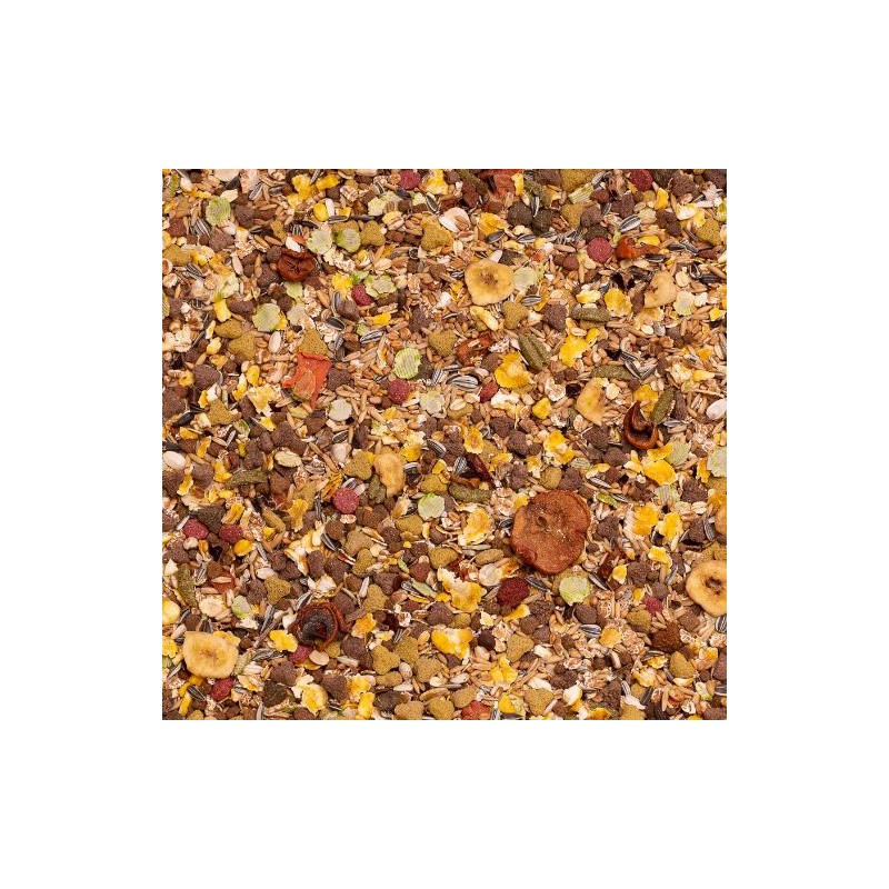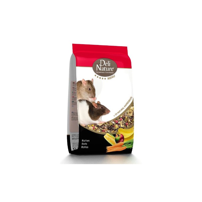 Alimentation complète pour Rat. 1. Supplément de protéines animales Omnivores par nature, les rats recherchent une alimentation très variée. Le Menu 5* de Deli Nature pour rats, supplémenté en granulés extrudés, est riche en protéines animales hautement digestibles de qualité d’une grande appétence pour les rats. 2. Enrichi en grains éclatés Le Menu 5* de Deli Nature pour rats contient des grains éclatés sous forme de flocons de maïs, de blé et d’avoine. Le traitement des grains entraîne la décomposition de l’amidon et d’autres nutriments, ce qui accroît et améliore la digestibilité et l’assimilabilité biologique. 3. Enrichi de fruits Les rats raffolent des fruits. Le Menu 5* de Deli Nature pour rats contient différents types de fruits, tels que de la caroube, des rondelles de banane et du doucin. La grande variété des ingrédients naturels transforme le Menu 5* de Deli Nature pour rats en un véritable régal pour ces rongeurs. Sac de 2,5 kg.