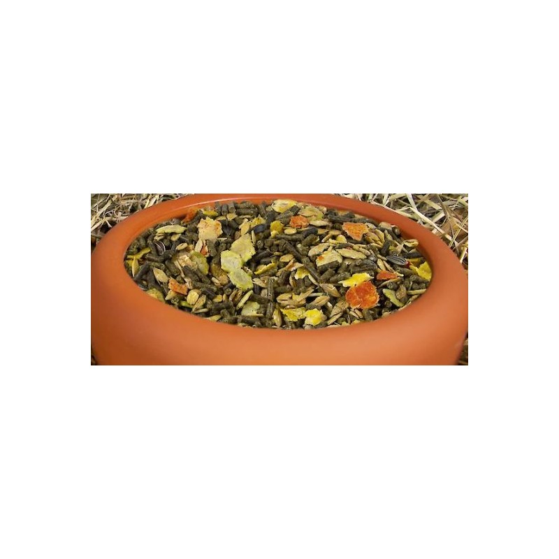 | Composition | Flocon d’orge 27%, Extraits de tournesol broyées 10.6%, Flocon de pois 10%, Petit blé 10%, Luzerne 9.9%, Flocon de mais 5%, Son d'avoine 4.4%, Orge 4.4%, Germe de malt 3.8%, Flocon de blé 3.6%, Tournesol 2.3%, Mélasse 2%, Carotte en flocon 2%, Huile de colza 1%, Carbonate de calcium 0,84%, Acide gras d'origine végétal 0,48%, Chlorure de sodium 0,46 %, Extraits de plantes 0,02% |