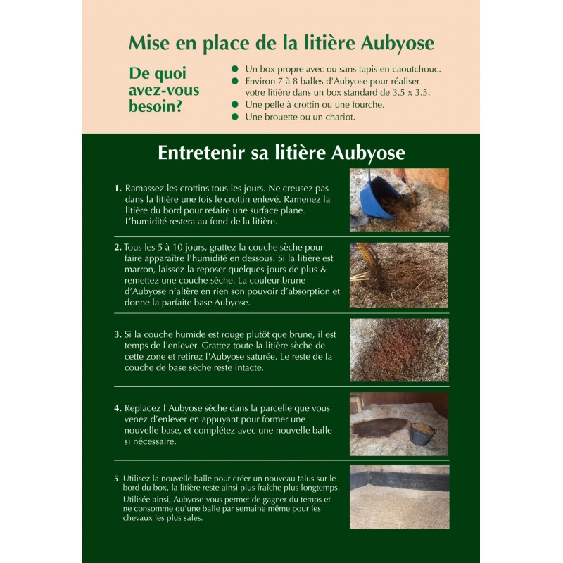 Aubyose est une litière très différente, elle vous permet d’économiser du temps et du travail. Elle fonctionne en absorbant les liquides dans une petite zone, dans la couche inférieure de la litière. La galette qui se forme évite le mélange de la litière humide avec la litière sèche. La couche supérieure de la litière reste agréable, douce et sèche pour le cheval.