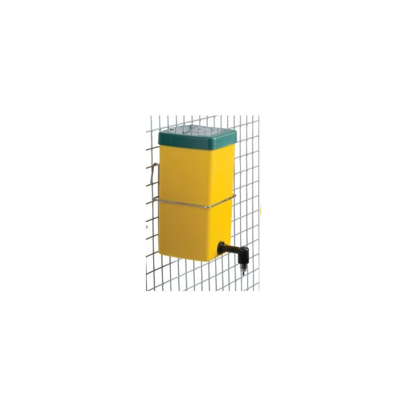 Abreuvoir réservoir couleur jaune de contenance 1 litre avec couvercle ; le fait de pouvoir enlever le couvercle permet de nettoyer l'intérieur et le fond de l'abreuvoir. L' abreuvement se fait par une pipette fixée sur un prolongateur en plastique, un crochet en U permet de maintenir le réservoir sur un grillage ou une porte à barreau.