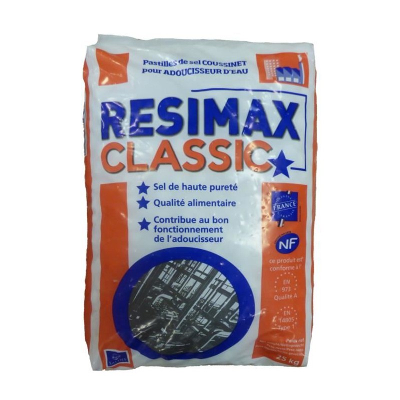 Le sel Résimax est un produit élaboré à partir d'un sel de qualité alimentaire de haute pureté qui garantit le bon fonctionnement des adoucisseurs d'eau. Les pastilles Resimax Classic® ont une teneur en sel supérieure à 99.9%. Elles ne contiennent aucun élément nuisible susceptible de diminuer les performances de l'adoucisseur (encrassage des résines, colmatage de la crépine d'aspiration...)