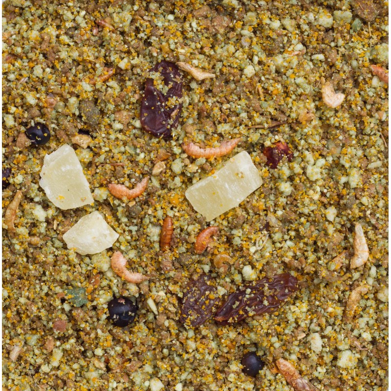 | Composition minérale | Produits de la boulangerie, extraits de protéines végétales, sucre, fruits (min. 9% dont 33% raisins, 24% ananas, 23% papaye, 10% baies de sorbier, 10% baies de genièvre), sous-produits d’origine végétale, huiles et graisses, substances minérales,mollusques et crustacés (min. 2,5% dont 30% gammares, 70% écrivisses) |