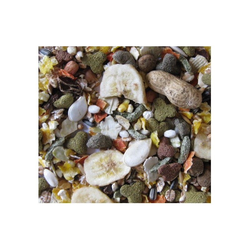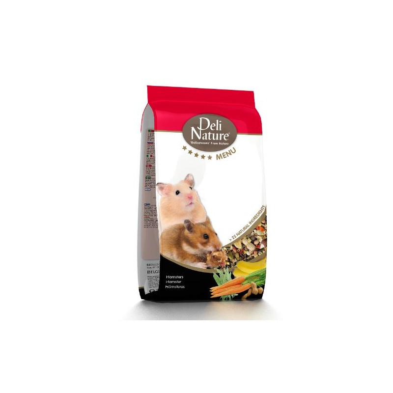 Aliment complet pour hamster 1. Supplément de protéines animales Omnivores par nature, les petits rongeurs, tels que les hamsters, ont besoin de protéines animales en plus des aliments d’origine végétale. Le Menu 5* de Deli Nature pour hamsters, supplémenté en granulés extrudés, est riche en protéines animales hautement digestibles de qualité. 2. Enrichi de fruits et de noix Les hamsters étant des rongeurs, le Menu 5* de Deli Nature pour hamsters contient de nombreuses friandises parmi lesquelles des arachides, de la caroube, des rondelles de banane, des graines de tournesol, des graines de potiron, etc. Le Menu 5* de Deli Nature pour hamsters, contenant plus de 20 ingrédients, garantit une alimentation variée pour ces petites bêtes. 3. Enrichi de grains éclatés Le Menu 5* de Deli Nature pour hamsters contient des grains éclatés sous forme de flocons de maïs, de blé et d’avoine, et de maïs, blé et riz soufflés. Le traitement des grains entraîne la décomposition de l’amidon et d’autres nutriments, ce qui accroît et améliore la digestibilité et l’assimilabilité biologique. Sachet de 750 gr.