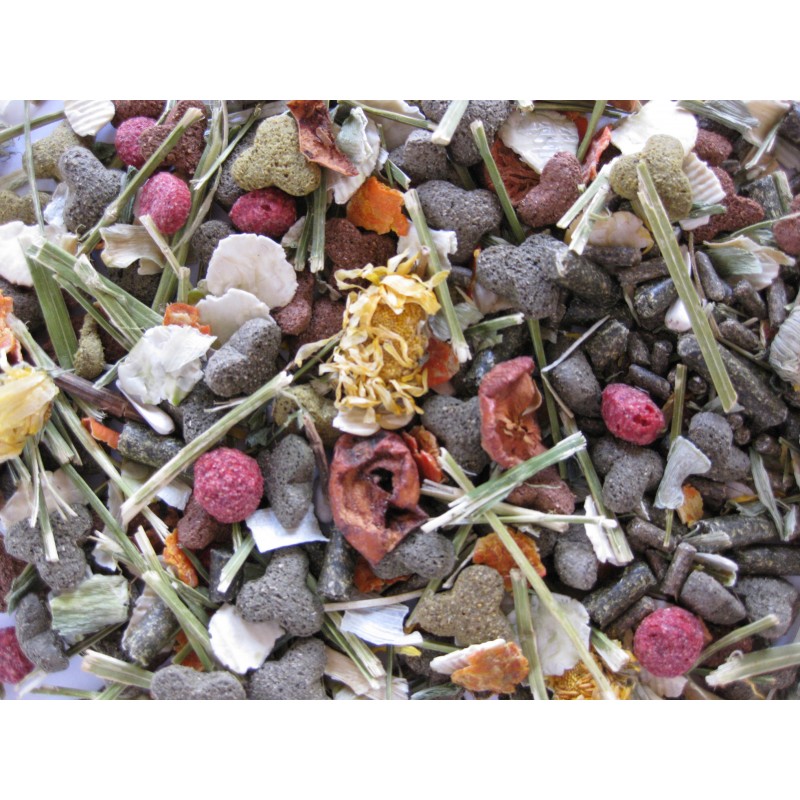 Alimentation complète pour lapin nain 1. Idéal pour l’appareil intestinal sensible Le Menu 5* Sensitive de Deli Nature pour lapins nains sensibles ne contient ni grains entiers ni granulés pressés (pellets). Les grains présentent généralement des teneurs élevées en amidon. Les aliments riches en amidon sont souvent insuffisamment digérés dans l’intestin grêle du lapin en raison de la rapidité du transit. Un excès d’amidon dans l’intestin peut avoir un effet négatif sur la flore intestinale, tout particulièrement lorsque l’apport en fibres est insuffisant. De plus, l’amidon constitue une importante source d’énergie. Comme les lapins plus âgés peuvent avoir une prédisposition au surpoids, le Menu 5* Sensitive de Deli Nature pour lapins nains sensibles est également indiqué pour les lapins âgés. 2. Enrichi d’herbes des champs et de paille de luzerne Le Menu 5* Sensitive de Deli Nature pour lapins nains sensibles contient un mélange d’herbes des champs parmi lesquelles des tiges de luzerne, de l’ortie, des soucis, du pissenlit, de la mélisse, de la menthe et de la camomille. Le mélange contient par ailleurs une fraction de paille de luzerne. Riche en fibres digestibles, la paille de luzerne favorise la fonction intestinale et stimule la croissance équilibrée de la flore intestinale. 3. Haute teneur en fibres brutes Le Menu 5* Sensitive de Deli Nature pour lapins nains sensibles est tout particulièrement riche en fibres. La teneur en cellulose brute joue un rôle important chez le lapin dans la consolidation de sa flore intestinale, la stimulation de la mobilité intestinale et la réduction du risque d’entérite. Pour stimuler la flore intestinale de façon optimale, il est d’ailleurs important de bien équilibrer l’apport en fibres digestibles et non digestibles. Sac de 2,5 kg.